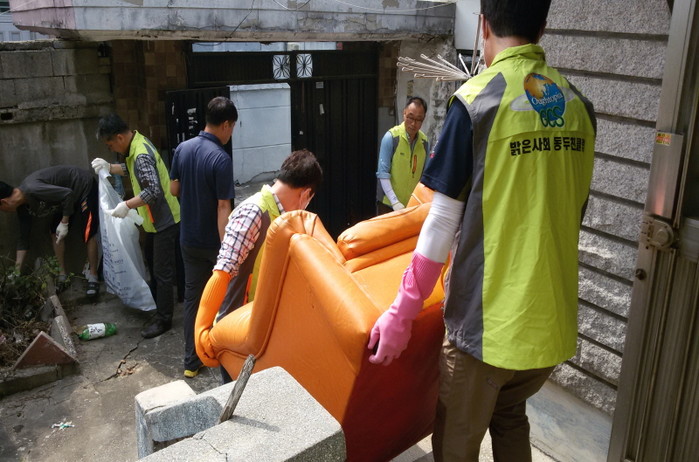최근 경기 동두천 밝은사회국제클럽과 희망지킴이 천사운동본부는 거주 환경이 취약한 이웃을 위해 주거환경 개선을 위한 봉사활동을 실시했다. 사진은 봉사에 참석한 관계자들이 집을 청소하는 모습.(사진제공=동두천시청)