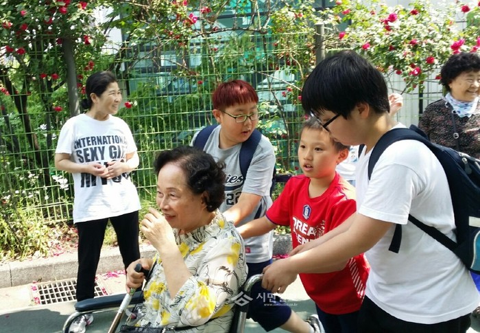 최근 서울 성동구 금호1가동에서는 동네주민 및 금북초등학교 봉사동아리 어린이들과 홀몸노인들이 함께하는 ‘세대공감 소풍’ 행사를 진행했다. 사진은 학생들이 거동이 불편한 노인의 휠체어를 밀어주고 있는 모습.(사진제공=성동구청)