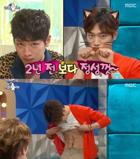 이날 그는 개인기로 2년 전 모습을 상기시켰다. 장화 신은 고양이 표정 짓기, 복근 공개, 다리 찢기 3종 개인기를 또 한 번 재현했다.