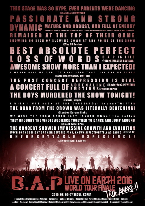 한편 올림픽공원 SK 핸드볼 경기장에서 8월 6일, 7일 이틀동안 개최될 'B.A.P LIVE ON EARTH 2016 WORLD TOUR FINALE TRUE AWAKE!!'는 오는 6월 20일부터 인터파크에서 팬클럽 선예매를 시작으로 22일에는 일반 관객들을 대상으로 티켓 예매가 오픈된다.