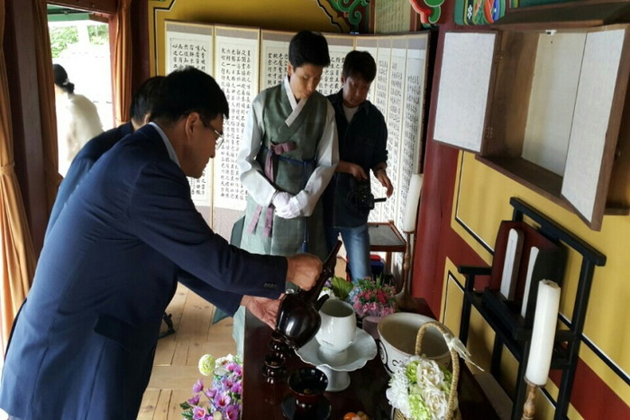 최근 경기 김포시 하성면에 위치한 한재당(경기도 지방기념물 제47호)에서 우리의 차와 멋을 음미하고 한재 이목 선생의 선비 정신을 기리기 위해 차를 올리는 헌다례(獻茶禮)가 거행됐다. 사진은 박동균 부시장이 차를 올리는 모습.(사진제공=김포시청)