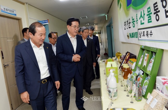 최근 서울 동대문구와 경기 연천군은 군청 대회의실에서 양 지자체 의원, 유관단체장 등 50여명이 참석한 가운데 자매결연 협정식을 체결했다. 사진은 군청을 방문한 유덕열 구청장(가운데)이 김규선 군수(왼쪽)로부터 군 특산물에 대한 설명을 듣는 모습.(사진제공=동대문구청)
