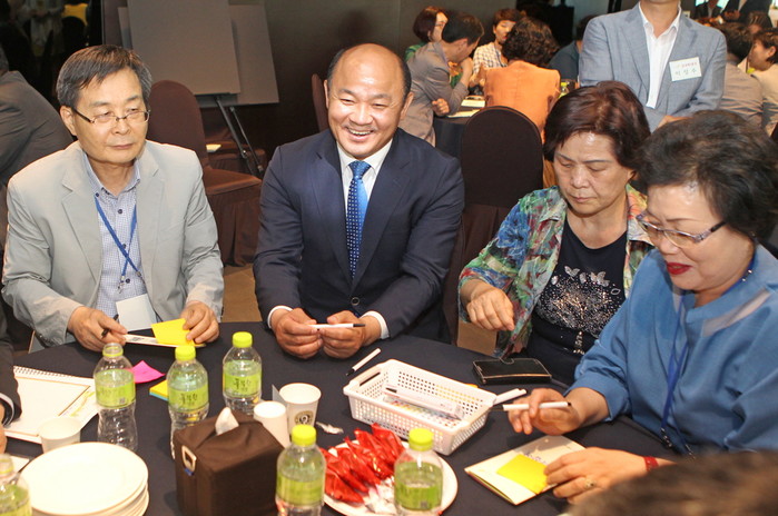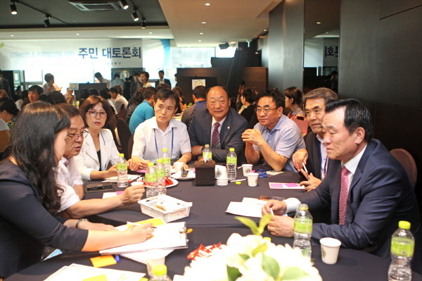 최근 성내동 강동문화센터에서 열린 ‘주민대토론회’에 참석한 김영철, 황인구 의원이 지역주민들과 격의 없이 대화를 나누며 지역발전을 위한 이야기와 강동의 미래를 위한 창의적 방안을 공유하고 있다.