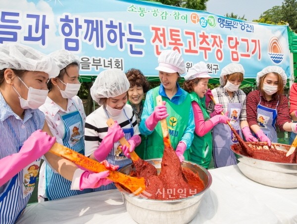 지난 9일 오전 서울 양천구 양천공원에서 열린 전통고추장 담그기 행사에 참석한 김수영 양천구청장(가운데)이 새마을부녀회, 다문화여성들과 함께 고추장을 담그고 있다.(사진제공=양천구청)
