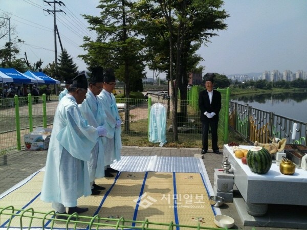 지난 9일 경기 용인시 처인구 포곡읍은 단오절(음력 5월5일)을 맞아 경안천변에서 주민 300여명이 참여한 가운데‘제6회 포곡 창포축제’를 개최했다. 사진은 관계자들이 축제에 앞서 제례를 지내는 모습.(사진제공=용인시청)