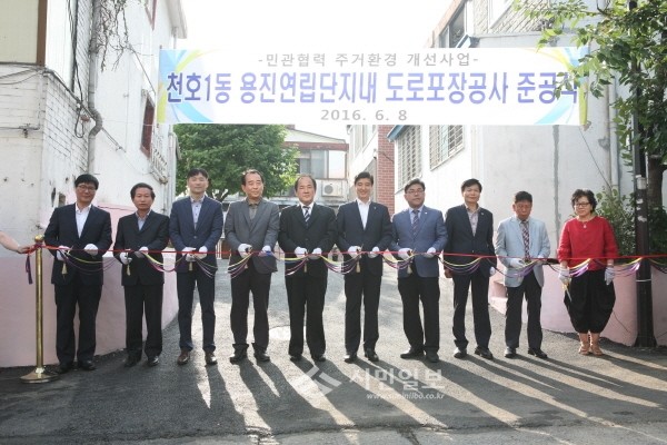 최근 이해식 서울 강동구청장은 천호1동 용진연립 단지에서 개최된 도로포장공사 준공식에 참석했다. 사진은 이 구청장(오른쪽에서 다섯번째)과 관계자들이 리본 커팅식을 하고 있는 모습.(사진제공=강동구청)