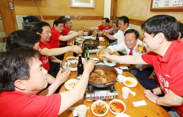 새누리당 친박(친박근혜)과 비박 핵심 의원들이 10일 오후 과천에서 열린 의원연찬회 직후 인근의 한 감자탕집에 모여 ‘계파 청산’을 외치며 건배를 하고 있다.정진석 원내대표와 친박 핵심인 최경환 의원의 제안으로 마련된 이날 자리에는 친박계에서 김태흠 제1사무부총장이, 비박계에서는 강석호 김성태 김학용 의원 등이 참석했다. 또 이 자리에는 재선 출신의 김재원 신임 청와대 정무수석비서관도 동석했다.