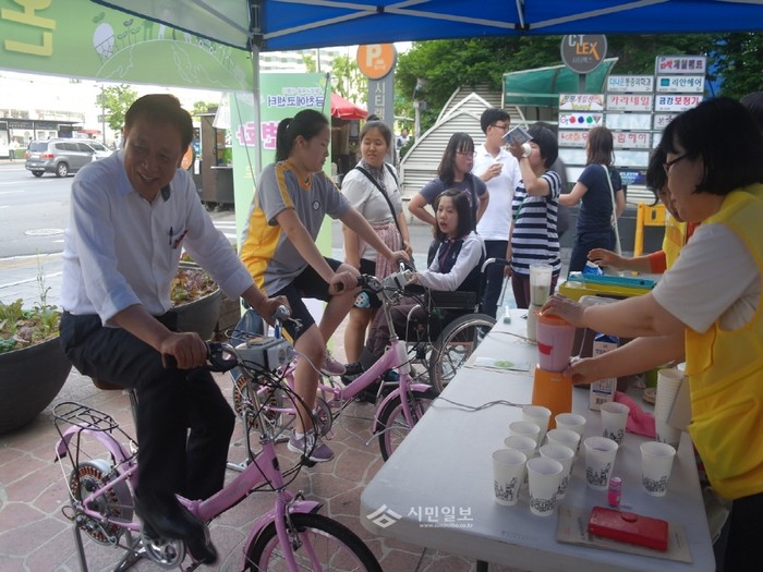 최근 서울 금천구는 독산동 시티렉스 앞 광장에서서 '제5회 금천에코라이프데이 캠페인'을 개최했다. 사진은 차성수 구청장(왼쪽)과 어린이들이 자가발전 자전거로 '주스 만들기 체험'을 하고 있는 모습.(사진제공=금천구청)