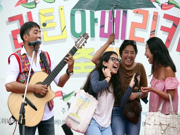 지난 11일 성북구가 주한 브라질·멕시코 등의 남아메리카 대사관과 손잡고 한성대입구역 2번 출구에 위치한 성북천 분수마루에서 '라틴아메리카 축제'를 개최했다. 사진은 '라밤바'를 부르며 즐거워하는 방문객들의 모습.(사진제공=성북구청)