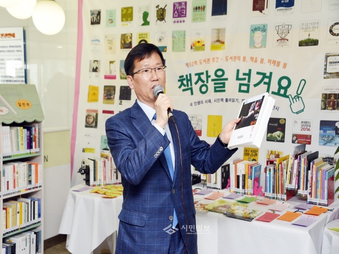 | ▲ 제52회 도서관 주관 '책장을 넘겨요!' 행사에 참석한 유영록 김포시장의 모습. | ||