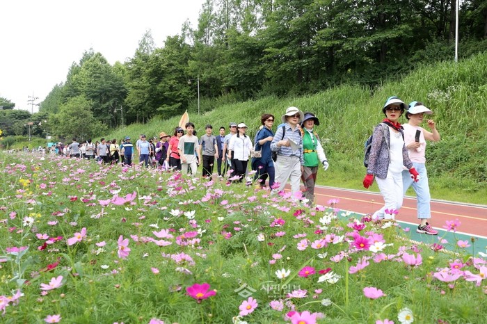 최근 서울 서초구는 지역주민 1500여명과 종합정비 후 달라진 양재천을 직접 걸어보는 '희망나눔 걷기한마당' 행사를 개최했다. 사진은 행사 참가자들이 새로 단장한 코스모스길을 걷고 있는 모습.(사진제공=서초구청)