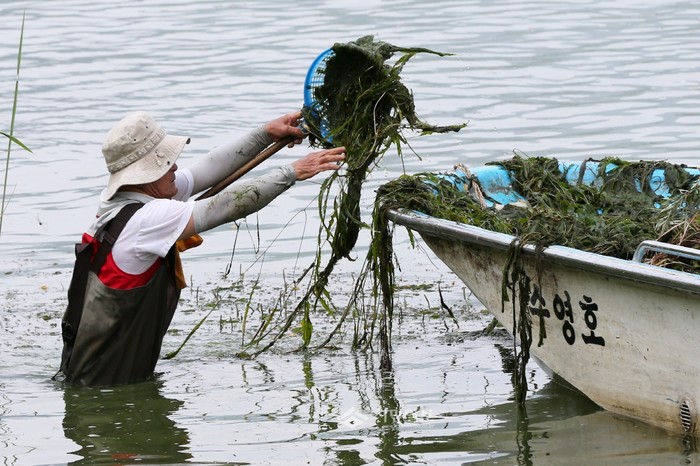 지난 13일 오후 대구 달성군 구지면 낙동강 도동나루터에서 인근 주민이 강에서 걷어 올린 녹조에 물든 식물을 배에 싣고 있다. 예년보다 빠른 더위로 주요 하천에 녹조 현상이 일찍 나타나 강물관리에 비상이 걸렸다.