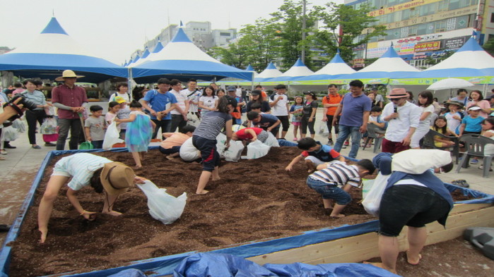 최근 경기 안산시는 안산문화광장에서 ‘농업! 도심속에서 싹을 틔우다’라는 주제로 ‘2016 안산시 도시농업 한마당’ 행사를 개최했다. 사진은 어린이들이 ‘텃밭속의 보물을 찾아라’ 프로그램을 진행하는 모습.(사진제공=안산시청)