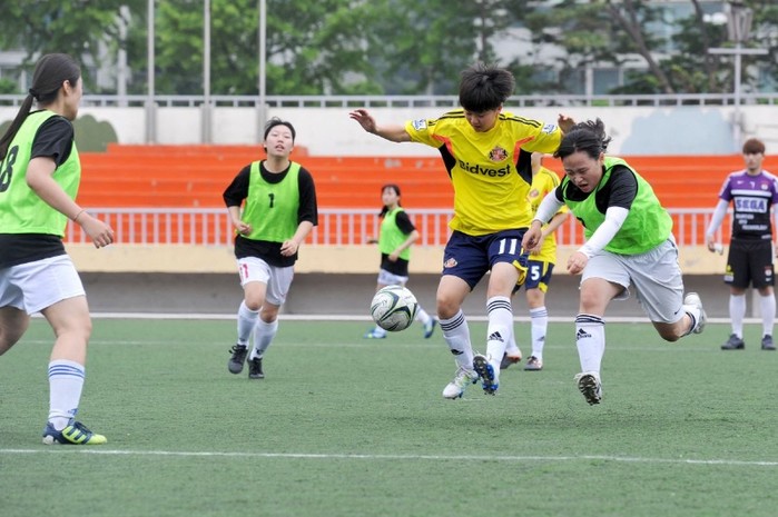 최근 경기 광주시 광주공설운동장과 보조경기장에서 '제4회 광주시체육회장기 고등부 남녀 축구대회'가 성황리에 개최됐다. 사진은 대회에 참가한 여자 고등부 축구선수들이 공을 다투고 있는 모습.(사진제공=광주시청)