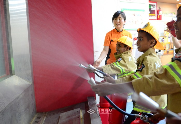 지난 14일 영등포소방서는 대한민국을 방문한 말레이시아 어린이들을 대상으로 '소방안전교육'을 실시했다. 사진은 말레이시아 어린이들이 소화기 사용 실습을 하는 모습.(사진제공=영등포소방서)
