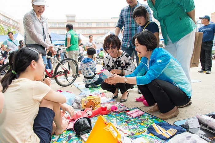 김수영 서울 양천구청장(오른쪽)이 최근 양목초등학교 운동장에서 열린 '은행정 한마음 나눔 축제'에 참석해 주민들과 함께 알뜰벼룩시장에서 판매하는 물건을 살펴보고 있다.(사진제공=양천구청)