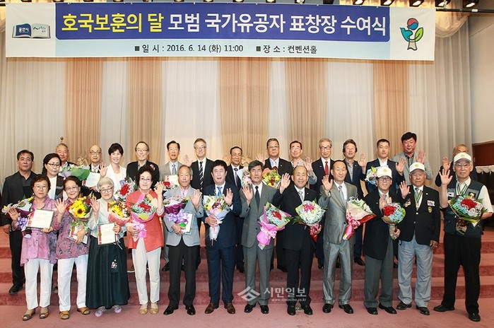 최근 경기 용인시는 시청 컨벤션홀에서 6월 호국보훈의 달을 맞아 광복회, 상이군경회, 6.25참전유공회 등 9개 단체에서 추천을 받은 모범 국가유공자 18명을 표창했다. 사진은 정찬민 시장(앞줄 왼쪽에서 여섯 번째)과 수상자들이 기념촬영하는 모습.(사진제공=용인시청)