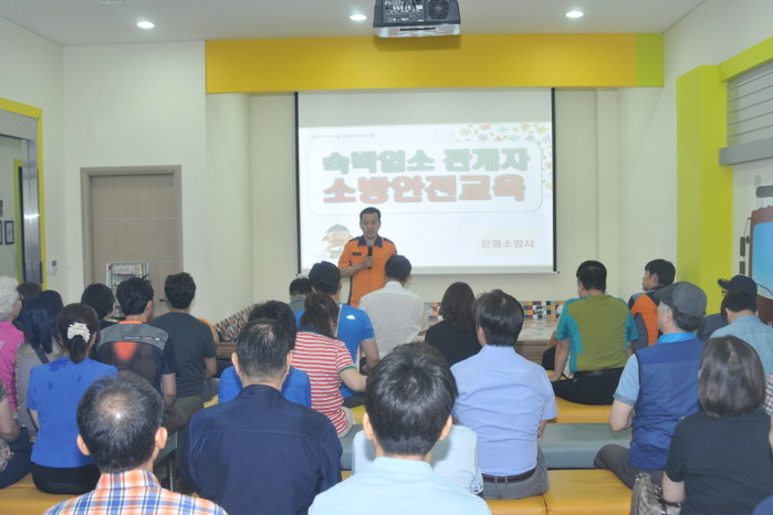 지난 15일 서울 은평소방서는 시민안전체험관에서 지역내 숙박업소 관계자를 대상으로 소방안전교육 및 체험을 실시했다. 사진은 소방관이 교육에 참석한 관계자들에게 강의하는 모습.(사진제공=은평소방서)
