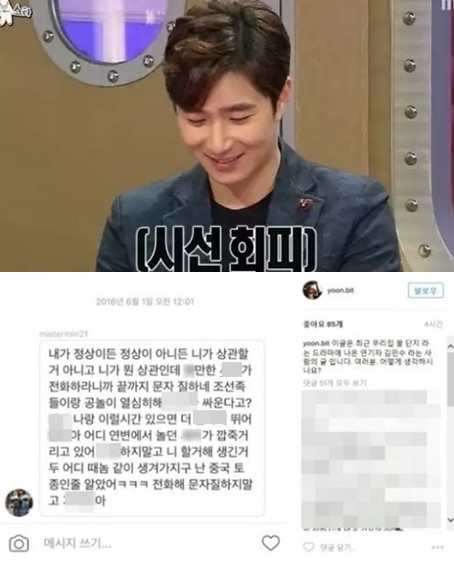 공개된 사진은 김민수가 윤빛가람에게 보낸 SNS 메시지로 "조선족들이랑 공놀이 열심히 해" "생긴 건 때놈같이 생겨가지고" 등 윤빛가람과 옌벤 푸더팀을 조롱하는 내용이 담겨있다.
