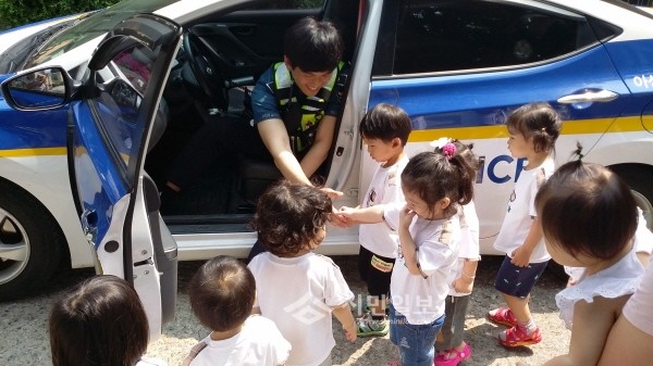 지난 17일 충남 아산경찰서 신창파출소에서는 신창면 소재지 친오애 어린이집 원생들을 파출소로 초청해 어린이 교통안전교육 등 체험학습을 실시했다. 사진은 경찰관이 교육에 참여한 어린이들과 악수하는 모습.(사진제공=아산경찰서)