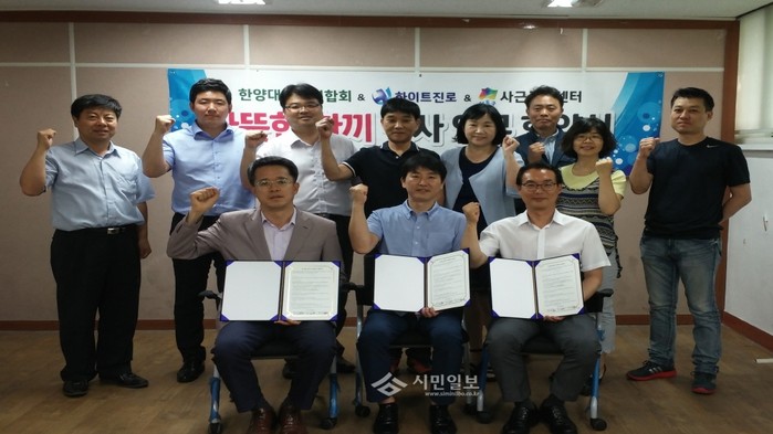 최근 성동구 사근동은 동주민센터에서 한양상인연합회, 하이트진로 주식회사와 함께 자원 재활용 및 저소득 소외계층을 돕기 위한 ‘따뜻한 한 끼’ 업무협약을 체결했다. 사진은 관계자들이 기념촬영하는 모습.(사진제공=성동구청)