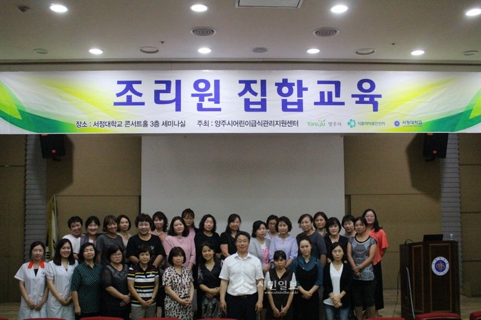최근 경기 양주시 어린이급식관리지원센터는 지역내 어린이집·유치원·지역아동센터 조리종사원 54명을 대상으로 개인 위생관리 등에 관한 교육을 실시했다. 사진은 교육에 참석한 관계자들이 기념촬영을 하는 모습.(사진제공=양주시청)