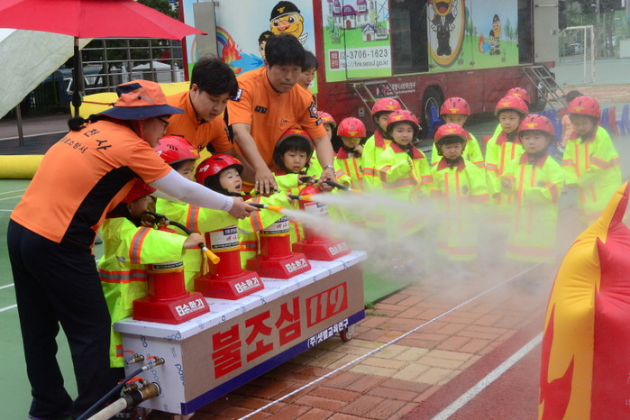 최근 서울 영등포소방서는 영등포동7가 소재 영중초등학교 병설유치원에서 지도교사와 어린이들을 대상으로 '이동 소방안전체험 교실'을 운영했다. 사진은 어린이들이 소화기 사용 실습을 하는 모습.(사진제공=영등포소방서)
