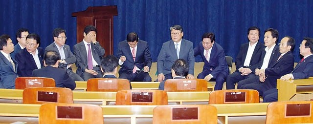 새누리당이 4.13 총선 과정에서 탈당한 의원들을 최근 복당시키며 내분을 겪고 있다. 20일 오후 국회 의원회관에서 새누리당 내 친박계 의원들이 복당문제 등 당 현안을 논의하고자 비공개회의를 하고 있다.