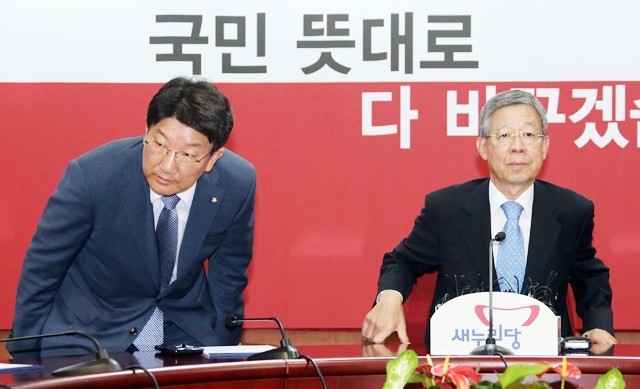 새누리당 김희옥 혁신비상대책위원장(오른쪽)과 권성동 사무총장이 20일 오전 서울 여의도 당사에서 열린 혁신비대위 회의에 참석하고 있다.
