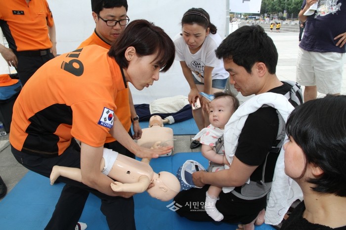 지난 19일 관악소방서는 종로구 광화문광장 희망나눔장터 행사에서 '찾아가는 안전체험교실 부스'를 운영했다. 사진은 소방관이 신생아 기도폐쇄시 응급처치법에 대해 교육하는 모습.(사진제공=관악소방서)
