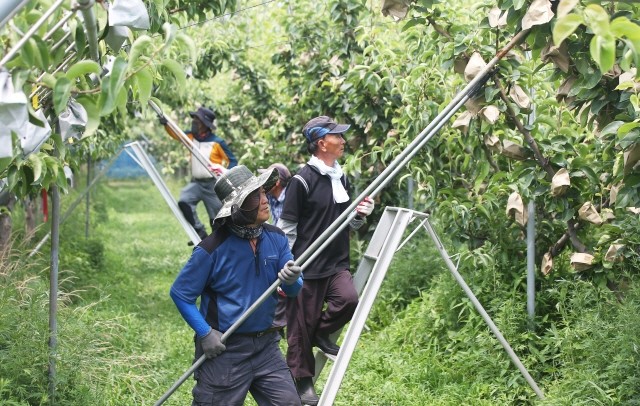 본격적인 장마를 앞둔 21일 오후 경기도 화성시 기산동 경기도농업기술원 배 과수원에서 관계자들이 지주대를 설치하고 있다.