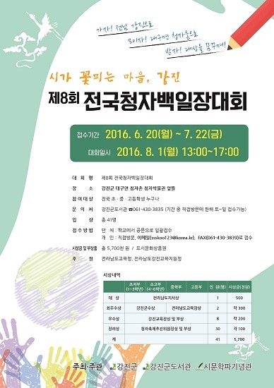 이번 전국청자백일장 대회는 대통령 직속 지역발전위원회 선정 2016창조지역사업‘시가 꽃피는 행복한 마을, 강진’프로젝트와 연계하여 진행된다.