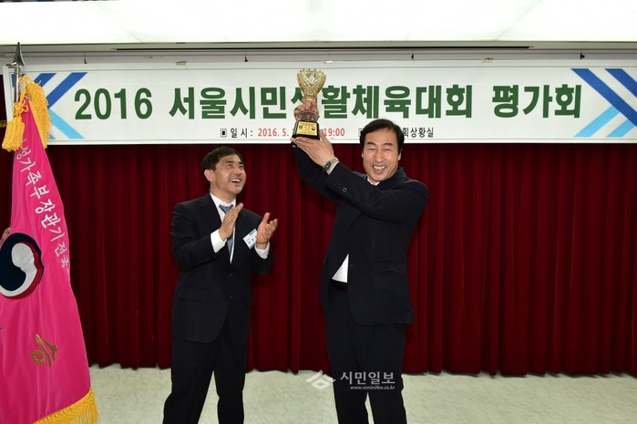 | ▲ '2016년 서울시민생활체육대회'에서 서대문구가 시민참여종목 종합 준우승을 기록한 가운데 문석진 구청장이 '평가회'에서 트로피를 들고 환하게 웃고 있다. | ||