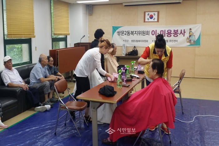 지난 20일 서울 도봉구 쌍문2동복지위원회는 동주민센터 회의실에서 저소득 홀몸노인 30여명을 대상으로 이·미용 봉사활동을 실시했다. 사진은 봉사자들이 노인들의 머리를 다듬고 있는 모습.(사진제공=도봉구청)