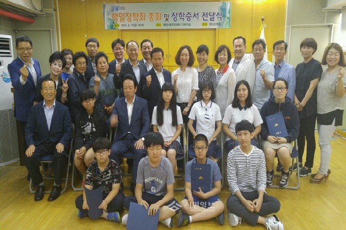 최근 서울 성동구 행당제1동 행일장학회는 행당1동주민센터에서 장학회원과 장학생, 그리고 학부모 등 40여명이 참석한 가운데 장학증서 수여식을 개최했다. 사진은 관계자들이 기념촬영하는 모습.(사진제공=성동구청)