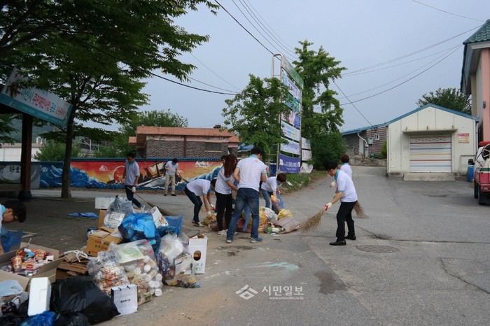 지난 20일 충남 아산시 음봉면에서는 제97회 전국체전 및 제36회 장애인 체전의 성공적 개최를 염원하는 ‘깨·친·아(깨끗하고 친절한 아산만들기) 릴레이'를 전개했다. 사진은 면사무소 직원들이 쓰레기를 수거하는 모습.(사진제공=아산시청)