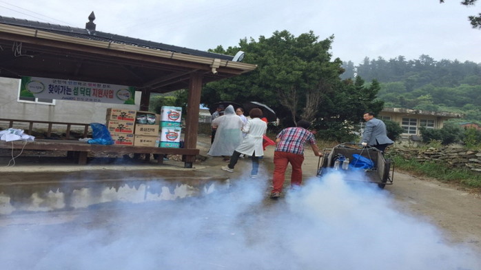 지난 20일 전남 진도군 주민자치위원회는 지역민 화합과 지역 발전을 위해 27명이 거주하는 저도를 방문해 마을 풀베기와 미용, 방역, 바닷가 청소와 함께 라면, 화장지 등 생필품을 전달하는 봉사활동을 펼쳤다. 사진은 관계자들이 방역을 하고 있는 모습.(사진제공=진도군청)