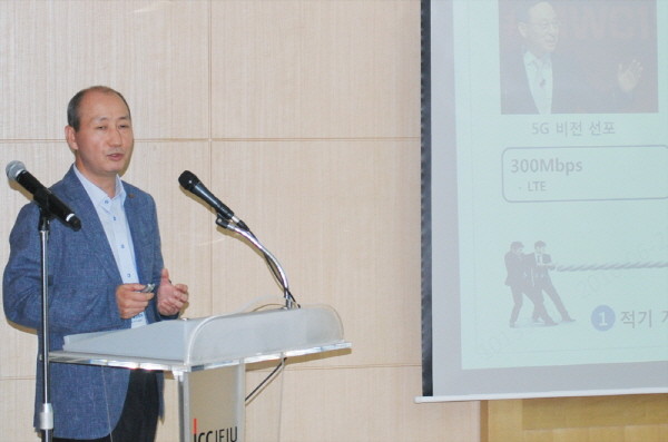 | ▲ 오성목 KT 네트워크부문 부사장이 한국통신학회 특별세션에서 ‘평창 5G 규격’을 발표하는 모습. | ||