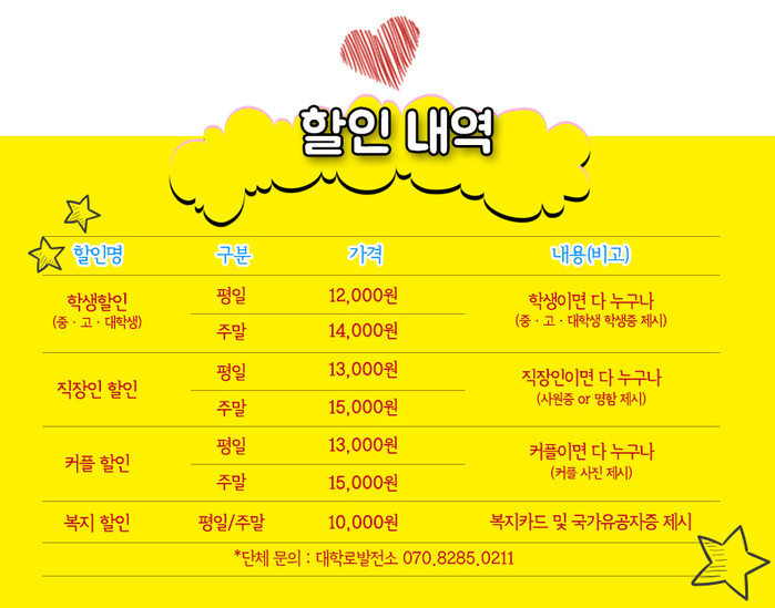 공연은 26일 5시30분까지 대학로 샘터파랑새극장 2관에서 진행되며, 직장인·커플은 평일 1만3000원, 주말 1만5000원, 학생은 평일 1만2000원, 주말 1만4000원이다. 또 복지카드나 국가유공자증을 제시하면 복지 할인도 받을 수 있다.