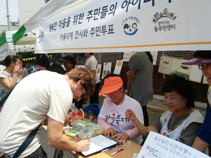 최근 서울 성동구 성수1가2동 마을계획단은 ‘성수동 시간여행’이라는 주제로 개최된 마을축제 현장에서 마을의제에 대한 주민들의 의견을 듣는 ‘마을의제 전시와 주민투표’를 실시했다. 사진은 동에 거주하고 있는 한 외국인이 주민투표를 하고 있는 모습.(사진제공=성동구청)
