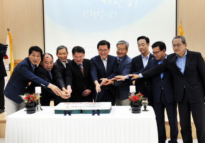 지난 22일 서울 동대문구는 다사랑 행복센터 10층 강당에서 구의 장애인 복지 증진에 중추적 역할을 담당할 '구립 동대문장애인종합복지관 개관식'을 개최했다. 사진은 유덕열 구청장(가운데)이 내빈들과 떡 케이크를 절단하는 모습.(사진제공=동대문구청)
