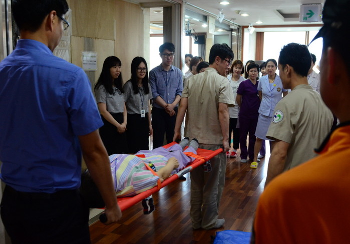 지난 22일 서울 영등포소방서는 노유자생활시설에서 소방공무원과 관계자가 참석한 합동 소방훈련을 실시했다. 사진은 재난발생시 자력대피가 어려운 환자를 이송하는 훈련을 하는 모습.(사진제공=영등포소방서)