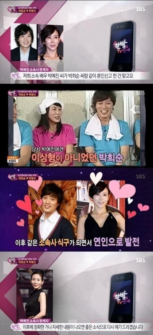당시 방송에서 박예진의 소속사 측은 “(박희순과) 교제 5년 만에 사랑의 결실을 맺었다”고 밝혔다.