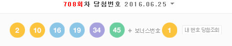 한편 제708회 나눔로또 당첨번호는 '2, 10, 15, 19, 34, 45', 보너스 번호는 '1'이다.