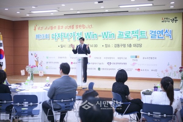 최근 강동구는 구청 5층 대강당에서 다자녀 31가정과 22개 후원 기업·단체가 참석한 가운데 '제13회 다자녀가정 Win-Win 프로젝트' 결연식을 개최했다. 사진은 결연식에 참석한 이해식 구청장이 축사하는 모습.(사진제공=강동구청)