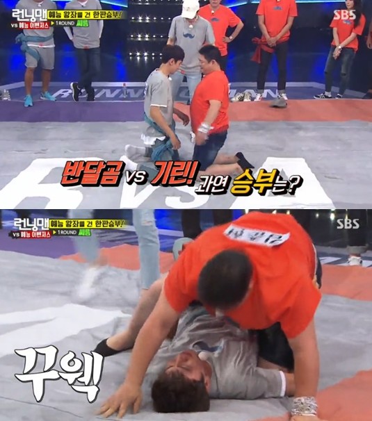 이날 김준현과 이광수는 예능 왕좌를 건 대결 1라운드에서 씨름경기를 펼쳤다.