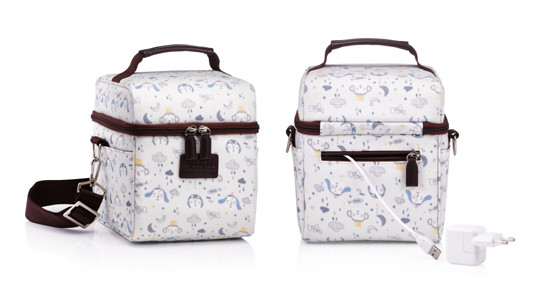 발열패드와 온도센서가 내장돼 있어 가방 내부를 40~70ºC로 지속적으로 유지해 분유 수유 적정온도인 40ºC 미만으로 유지시켜 주어 물의 온도를 따로 맞출 필요 없이 바로 따뜻한 수유가 가능하다. 또한 USB로 전원을 연결할 수 있어 휴대용 보조배터리나 차량에 꽂아 편리하게 사용이 가능하다.