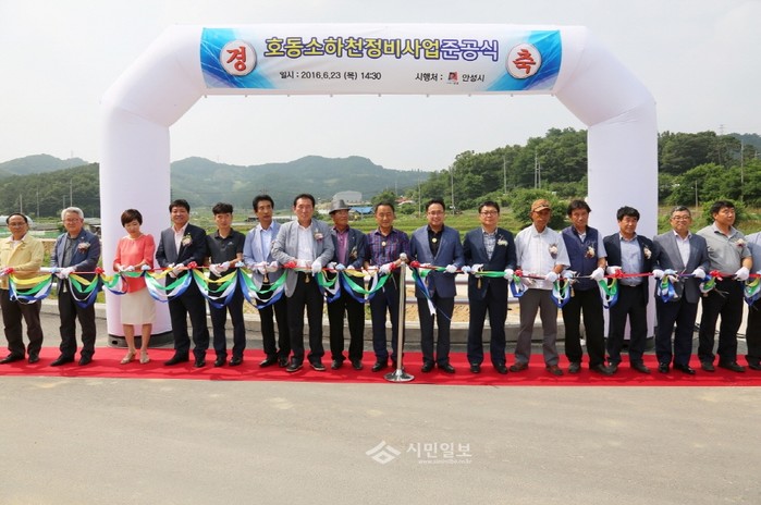 최근 경기 안성시는 2013년 3월 공사를 시작한 ‘호동소하천 정비사업’이 착공 3년 2개월 만에 완료됨에 따라 준공식 행사를 개최했다. 사진은 황은성 시장(오른쪽에서 여덟 번째)과 유광철 시의장(오른쪽에서 일곱 번째) 등 관계자들이 리본 커팅식을 하는 모습.(사진제공=안성시청)