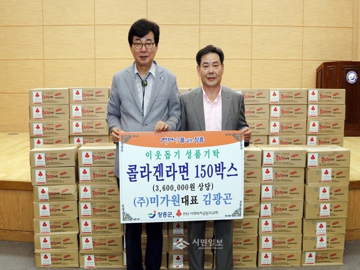 최근 기능성라면 제조업체인 (주)미가원이 전남 장흥군에 지역내 경로당과 장애인시설에 전달해 달라며 어린(魚鱗)콜라겐을 첨가해 만든 콜라겐라면 150박스(360만원 상당)를 전달했다. 사진은 김성 군수(왼쪽)와 관계자가 기념촬영하는 모습.(사진제공=장흥군청)