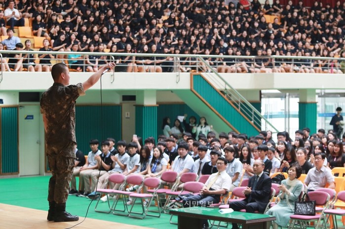 최근 경기 양주시 소재 육군 제65보병사단은 호국보훈의 달을 맞아 경민중학교·경민IT고등학교·경민대학 등 6개 학교, 2000여명의 학생을 대상으로 '나라사랑 콘서트'를 개최했다. 사진은 한 장병이 공연을 펼치는 모습.(사진제공=육군 제65보병사단)